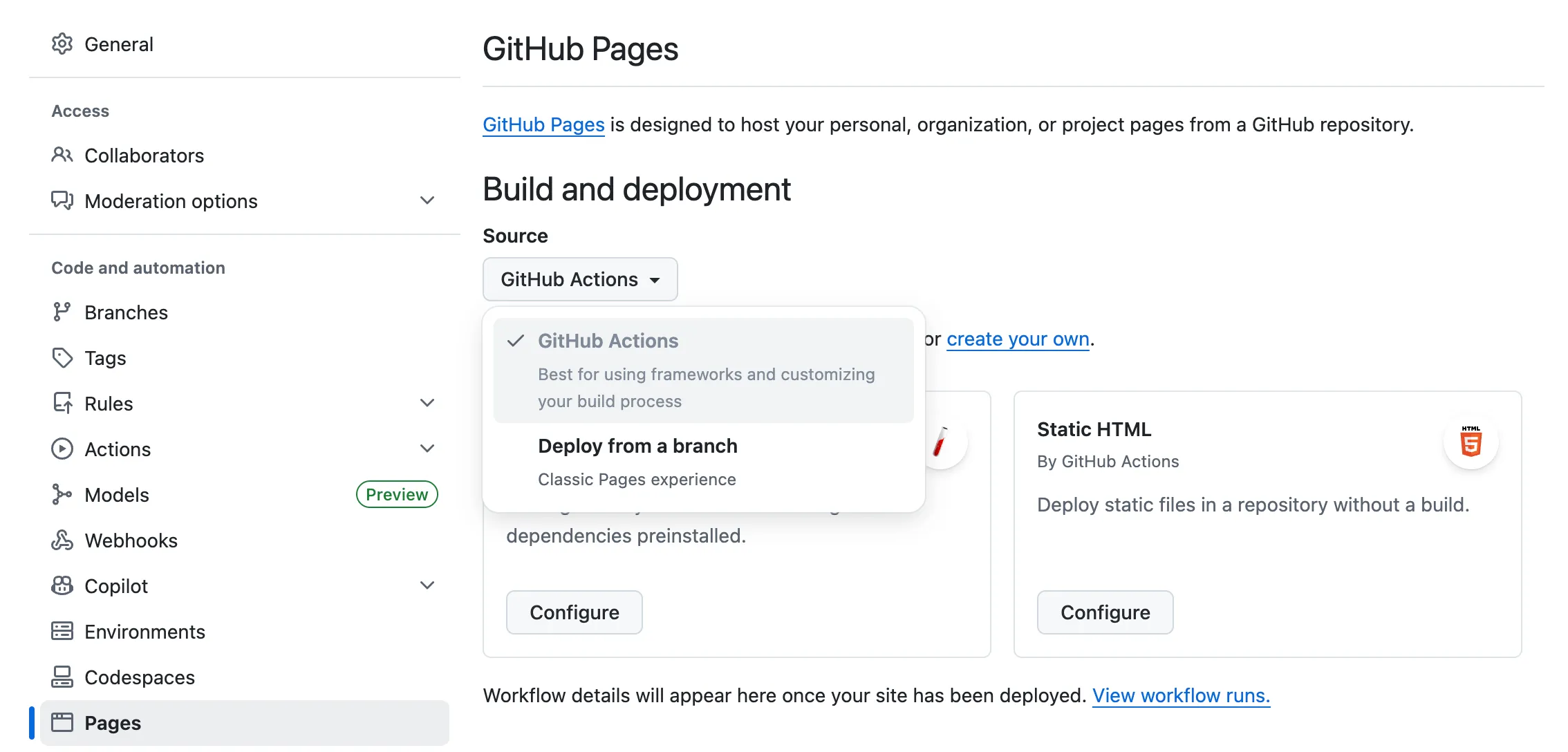 Under “Build and deployment”, select GitHub Actions for Source